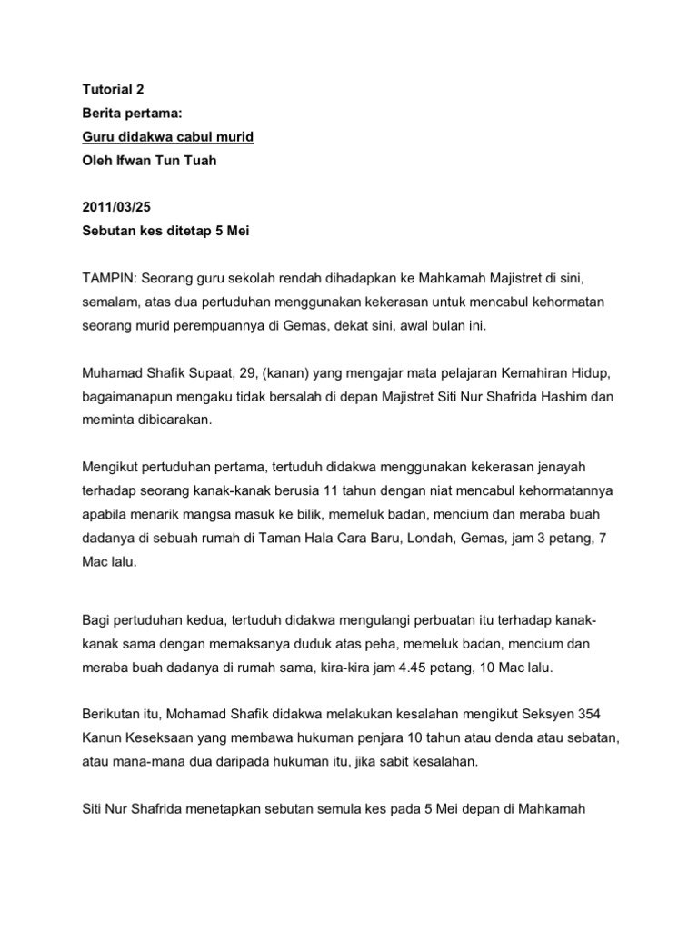 Ulasan Kritikal Artikel from img.dokumen.tips Download lagu mgtv dai syed didakwa mengikut seksyen 354 kanun (4.26 mb) mp3 dan video mp4 gratis di planet musik, streaming gudang lagu mgtv ada 20 gudang lagu mgtv dai syed didakwa mengikut seksyen 354 kanun terbaru, klik salah satu untuk download lagu mudah dan cepat. Perlakuan memasukkan alat kemaluan lelaki tidak berlaku, seksyen 354 terpakai untuk pendakwaan terhadap pesalah yang menyerang atau menggunakan kekerasan jenayah dengan niat untuk mencabul. Sebelum ini pengarah jabatan siasatan jenayah bukit aman, datuk huzir mohamed berkata, polis menerima tujuh laporan iaitu dua membabitkan seksyen 376 kanun keseksaan (rogol), tiga kes bagi seksyen 354 kanun keseksaan (cabul) dan satu kes di bawah seksyen 377c kanun keseksaan. 1.seksaan bagi kesalahan yang dilakukan dalam malaysia. Dia didakwa mengikut seksyen 323 kanun keseksaan yang memperuntukkan hukuman penjara maksimum setahun atau denda. Polis turut membuka tiga lagi kertas siasatan mengikut seksyen 354 kanun keseksaan (mencabul). Kanun keseksaan malaysia (akta 574) ialah suatu akta yang digubal bagi. Dia (papagomo) kini disiasat di bawah seksyen 147/323 kanun keseksaan kerana dengan sengaja mendatangkan kecederaan.