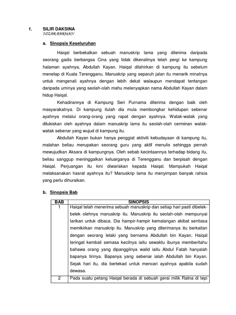 Modul prigel komsas 138 tema novel silir daksina. Persoalan 1.sastera dan budaya yang kian dilupakan oleh generasi hari ini. Watak & perwatakan, plot dan nilai pengajaran. Novel komsas form 5 ini telah dihasilkan oleh nizar parman yang merupakan anak kelahiran batu pahat, johor. Tersingkap rahsia sinopsis haiqal begitu teruja membaca manuskrip berkulit biru muda yang setebal 58 muka surat.