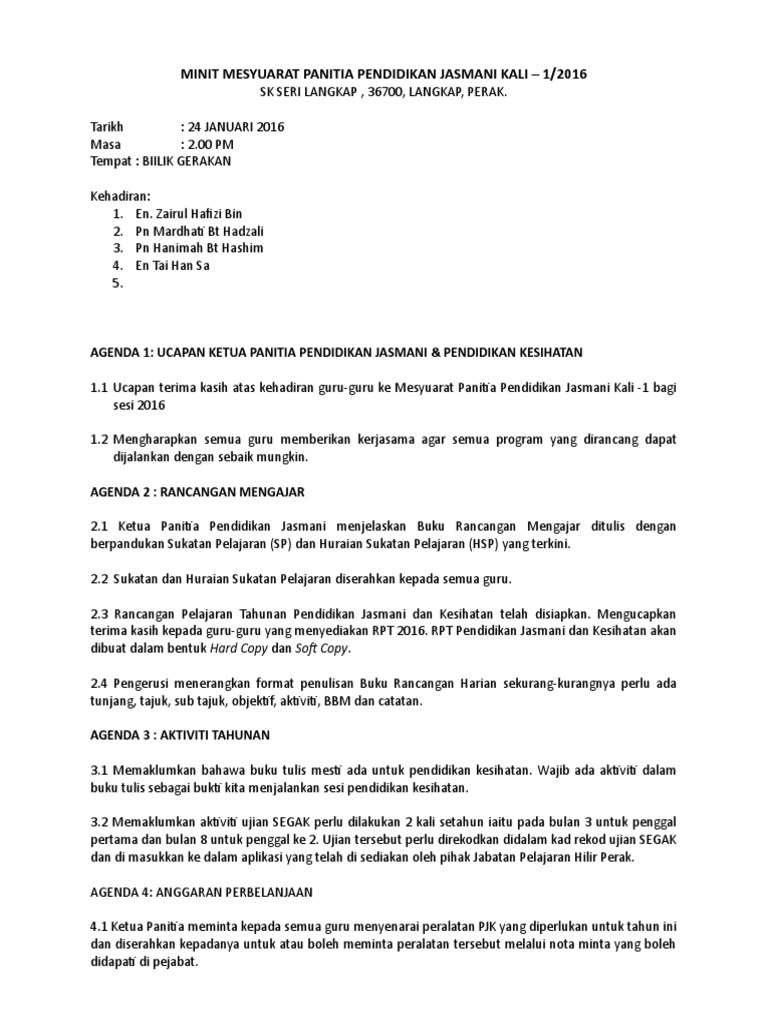 Minit Mesyuarat Panitia Pendidikan Jasmani - Senarai Kandungan Fail Panitia Mata Pelajaran Lengkap - En roslani bin maskan 2.. Minit mesyuarat panitia pendidikan jasmani kali ke 1 / tahun 2015 tarikh : 26 / 12 / 2018 masa : Mesyuarat pjk 1 sjkt lobak. Pendidikan jasmani & pendidikan kesihatan. Laporan minit mesyuarat pendidikan jasmani dan kesihatan kali pertama 2013 sekolah kebangsaan kampung jepak ( yba9102 ) d/a, pejabat pelajaran daerah bintulu, km 5, jalan sultan iskandar, 97000 bahagian bintulu.